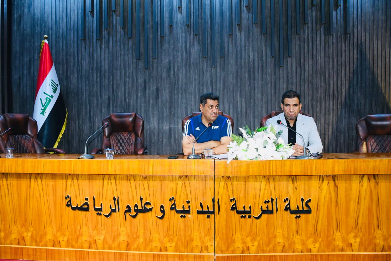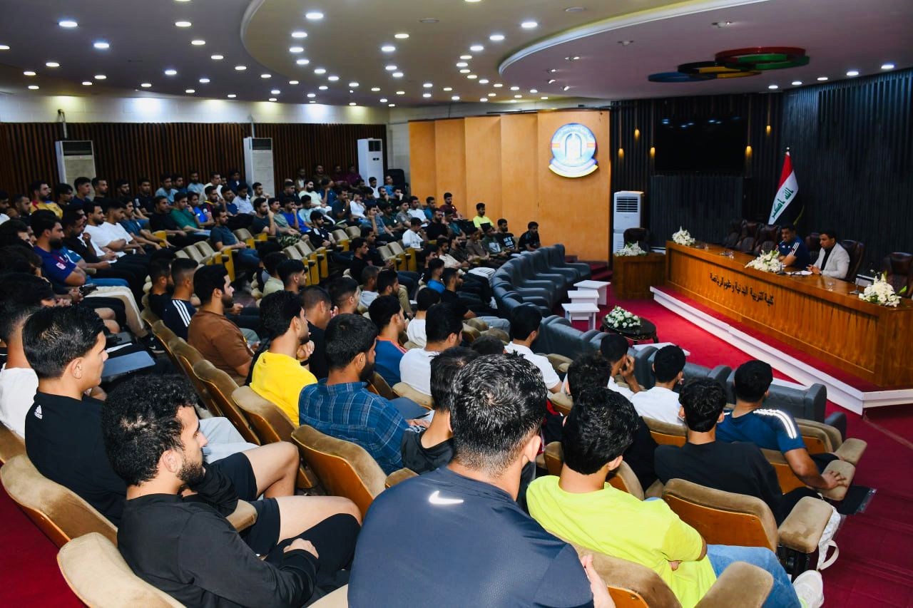 اجتمع السيد عميد كلية التربية البدنية و علوم الرياضة في جامعة بغداد الاستاذ الدكتور صباح قاسم خلف بطلاب المرحلة الرابعة وذلك ضمن سلسلة اللقاءات التوجيهية التي تنظمها الكلية مع بداية العام الدراسي (٢٠٢٥_٢٠٢٦) وحضر الاجتماع الاستاذ الدكتور فالح هاشم فنجان رئيس فرع العلوم النظرية.
