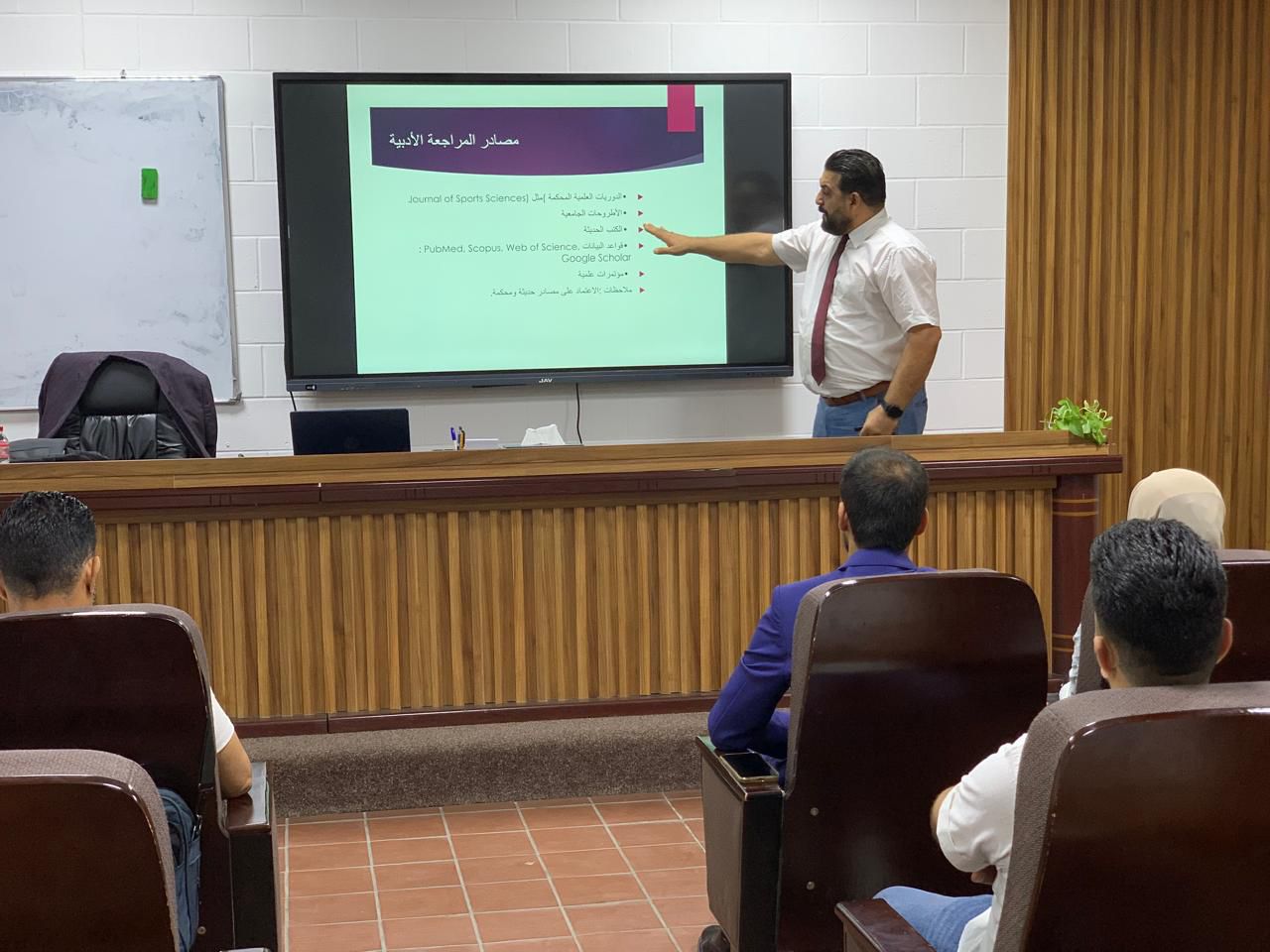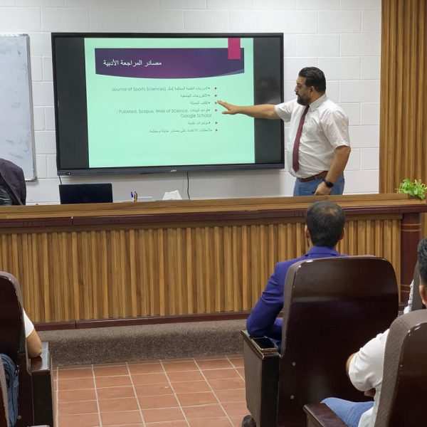 ضمن الأنشطة العلمية المستمرة، نظمت كلية التربية البدنية وعلوم الرياضة في جامعة بغداد (شعبة الدراسات العليا) ورشة علمية بعنوان (استعراض المراجع) قدمها الأستاذ الدكتور أحمد فرحان التميمي، لطلبة الدراسات العليا في الكلية.